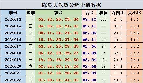 上期回顾,大乐透第2024022开奖,本期奖号:前区07 09 11 31 32;后区04 08,当期前区号码大小比为2:3,三区比3:0:2,奇偶比4:1。前区开出连号31 32,未开出重号。