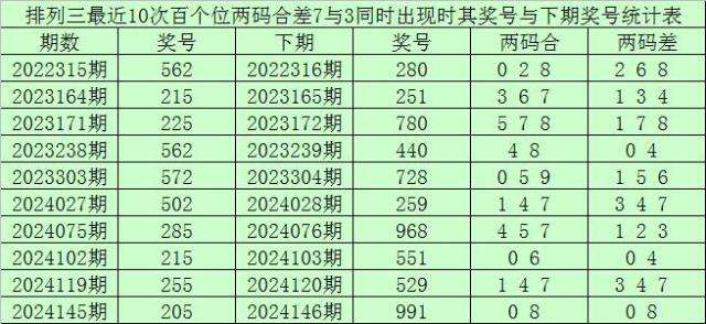 百个位合差分析:上期奖号百个位开出25组合,两码合为7,两码差为3,最近10次百个位两码合7与两码差3同时出现时,其奖号和下期奖号分别为: