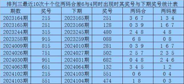 十个位合差分析:上期奖号十个位开出15组合,两码合为6,两码差为4,最近10次十个位两码合6与两码差4同时出现时,其奖号和下期奖号分别为: