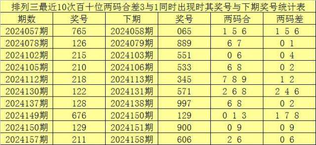 从以上统计可以看出,百十位两码合差3与1同时出现之后其下期两码合差表现最热的4个分别为:0126,本期百十位两码合差可以参考这四码中的数据。