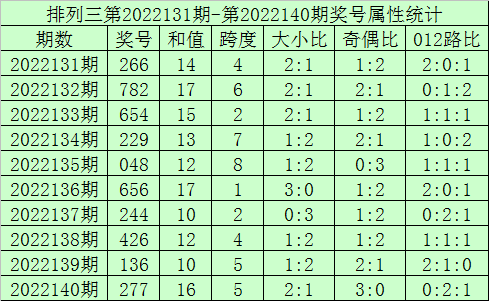 二、体彩排列三前9期奖号开出:654-229-048-656-244-426-136-277-755,其中奖号大小比为14:13,012路比为8:9:10,奇偶比为10:17;