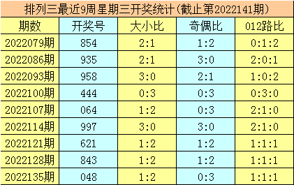 三、体彩排列三前9周星期三奖号分别开出:854-935-958-444-064-997-621-843-048,其中号码012路比为10:9:8,奇偶比为11:16,大小比为14:13;