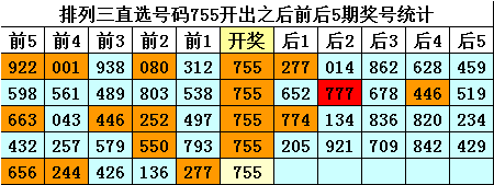 四、排列三直选号码755历史上开出5次,其前后五期奖号分别为: