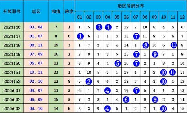 前区上期奇偶比为1:4,奇数号码冷出;近10期奇偶比为23:27,奇数号码冷出,本期预计奇数号码冷出,奇偶比为2:3。
