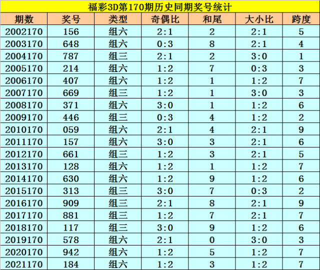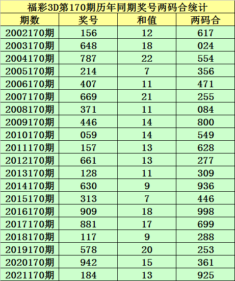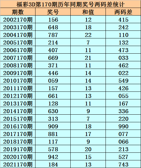 福彩3D第170期,历史上期开出20次奖号,其奖号分别为:156、648、787、214、407、669、371、446、059、157、661、128、630、313、909、881、117、578、942、184,奖号两码合差分别开出: