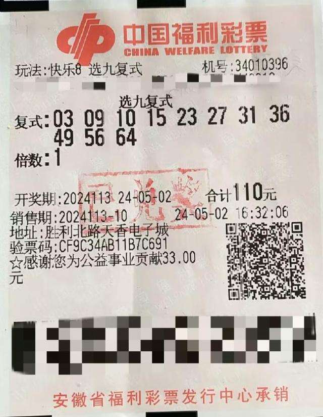 5月2日晚,福彩快乐8第2024113期开奖,位于合肥市胜利北路天香电子城的34010396号福彩投注网点传出中奖喜讯,幸运购彩者涂先生(化姓)凭借一张1倍投注的选九复式票,击中9个开奖号码,喜中“选九中九”1注,单注金额300000元,“选九中八”18注,单注金额2000元,“选九中七”36注,单注金额200元,中奖金额合计343200元。