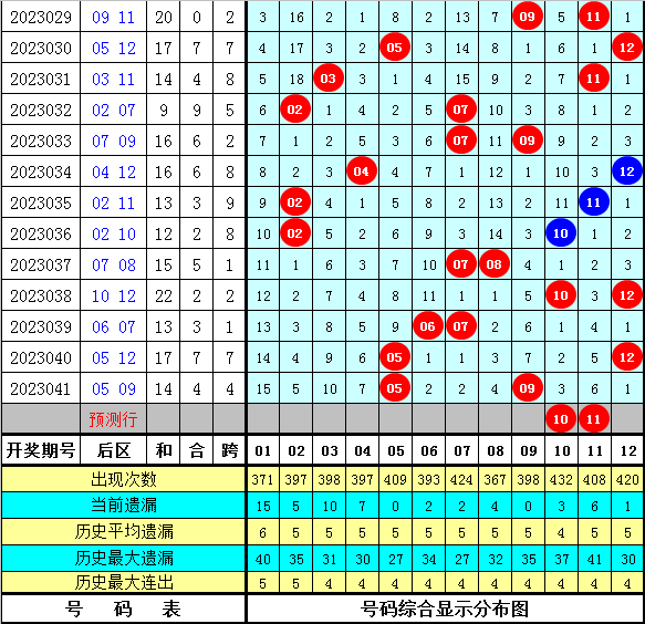 后区分析:在第042期历史同期开奖中,后区和值分别开出11、9、9、13、22、19、7、17、13、7、8、14、23、11、9、8,本期看好后区开出大和值,关注和值21。