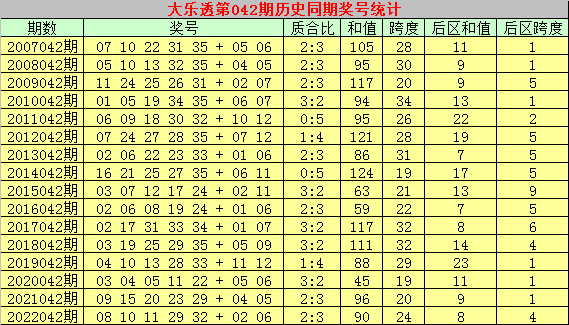 和值分析:历史同期第042期奖号前区和值分别开出:105、95、117、94、95、121、86、124、63、59、117、111、88、45、96、90,对比去年第042期同期奖号,本期预计和值下降,关注60-70区段和值。