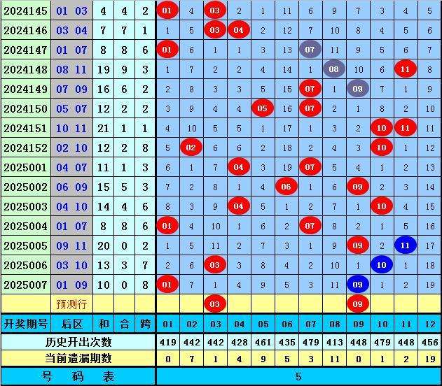 后区分析:上期后区开出一奇一偶、一大一小奖号01、09,近10期后区奖号奇偶比为12:8,奇数号码走势较热,后区奖号大小比为12:8,大号走势较热,本期预计后区奖号出现在03、04、09、11、12中,参考号码03、09。