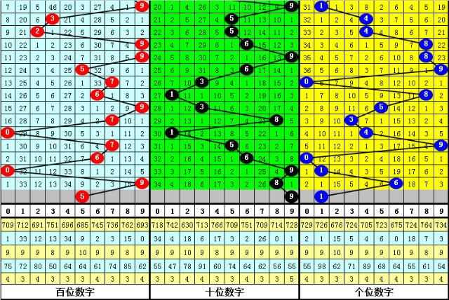 在历史同期号码中,组选0-9号码出现次数为:5、7、8出现3次,号码3出现4次,号码2出现6次,号码4、9出现7次,号码0、1出现8次,号码6出现11次,本期看好两码5、9出现。