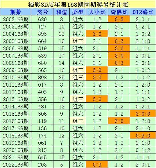 组选类型判断:在第168期历史同期开奖中,组六开出16次,组三开出5次,今年同期防开出组三号码。