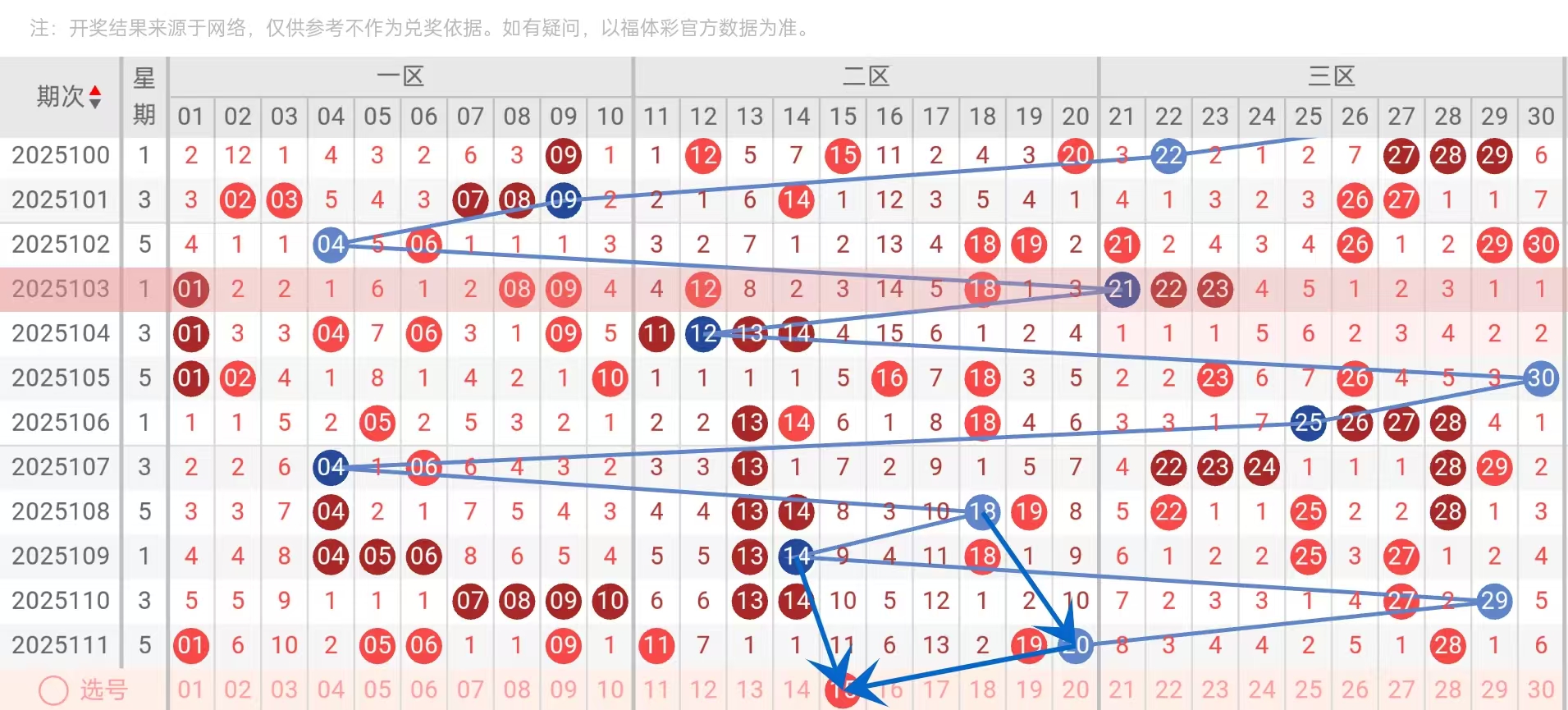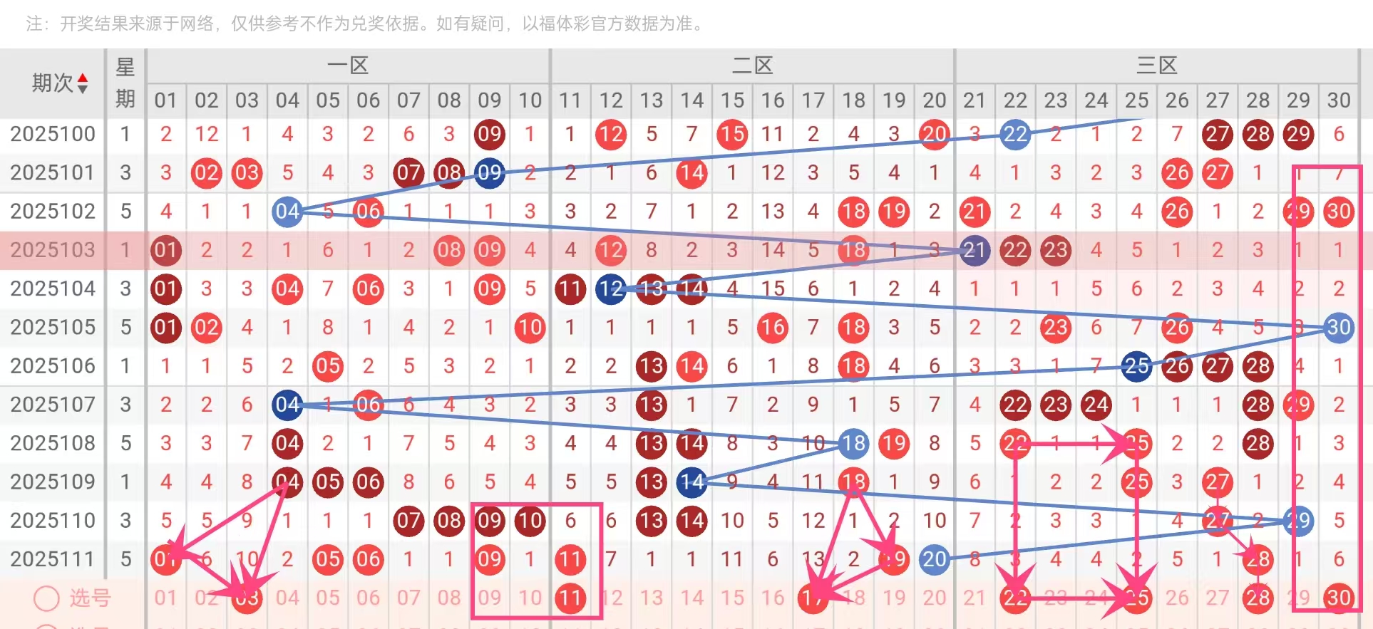 三区分布1:2:4(一区03、二区11/17、三区22/25/28/30):突破传统2:2:3模板,参考2024075期(1:1:5)及2024145期(1:3:3)等大奖结构。