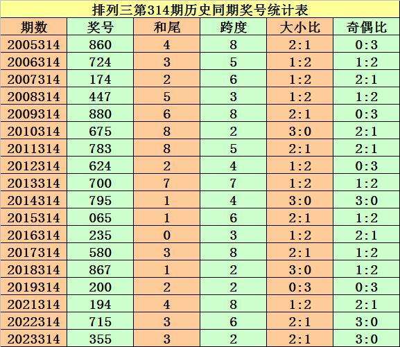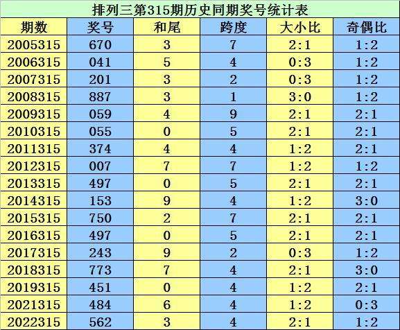 从2004年至今排列三已开出6735期奖号了,本期为排列三2023年第315期开奖,历史同期已出现17次奖号: