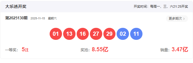 开奖号码:01 13 16 27 29- 02 11