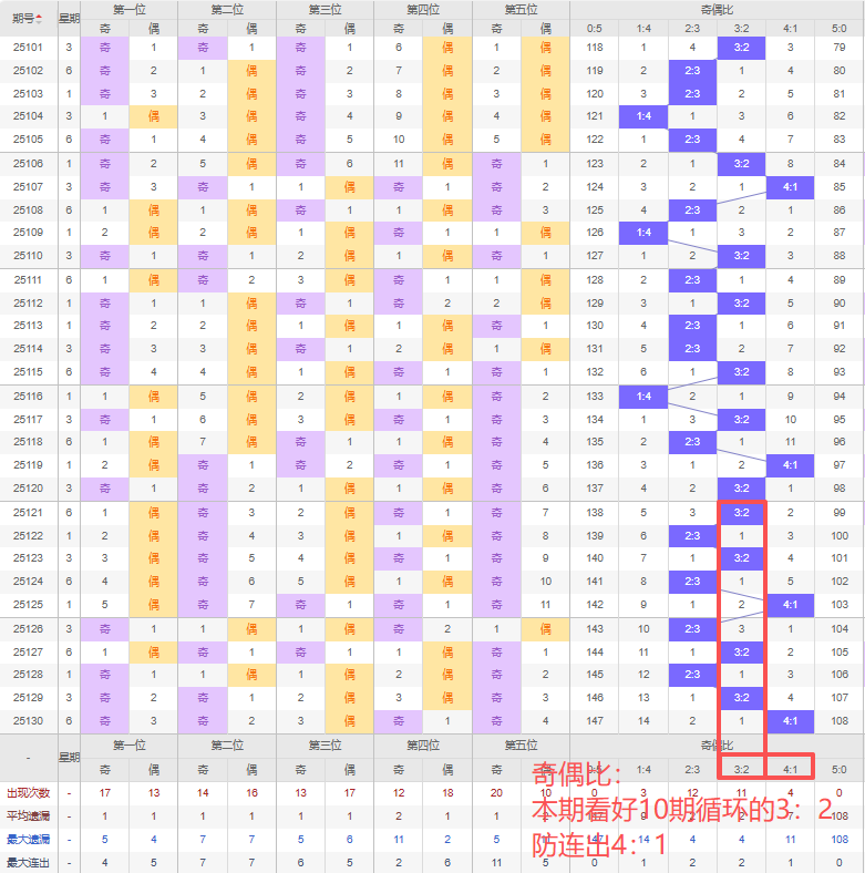 上期奇偶比:4:1,近10期奇偶比出现情况:3:2、2:3、3:2、2:3、4:1、2:3、3:2、2:3、3:2、4:1,最近10期出现4期3:2,出现4期2:3,出现2期4:1,出现0期1:4,出现0期5:0,出现0期0:5,根据近10期规律本期看好10期循环的3:2,防连出4:1,综上所述推荐奇偶比推荐:4:1,重点关注:3:2。