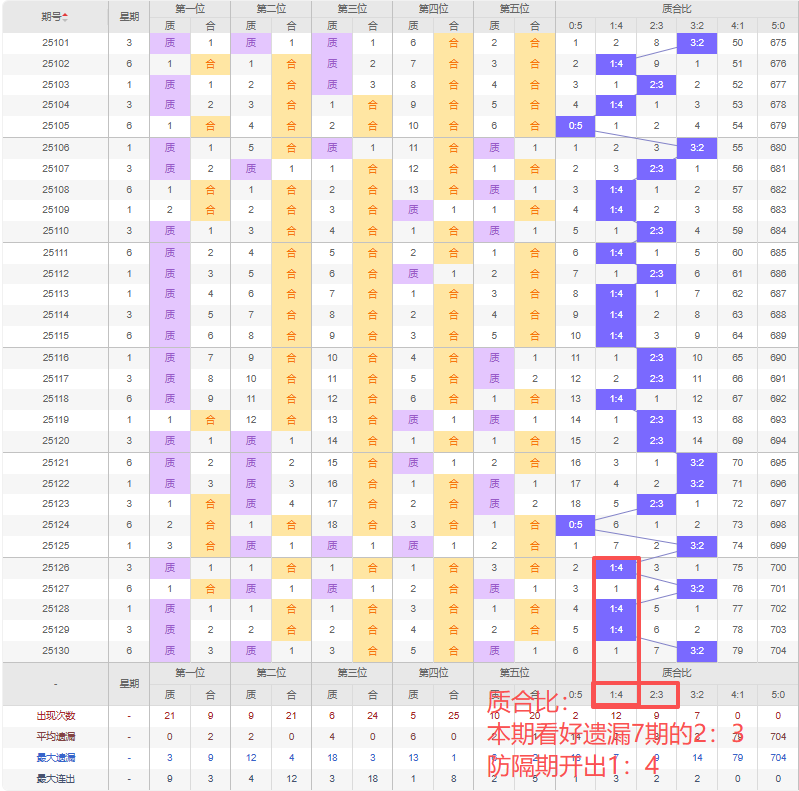 上期质合比:3:2,近10期质合比出现情况:3:2、2:3、2:3、0:5、3:2、1:4、3:2、1:4、1:4、3:2,最近10期出现5期3:2,出现1期2:3,出现0期4:1,出现3期1:4,出现0期5:0,出现1期0:5,根据近10期规律本期看好遗漏7期的的2:3,防隔期开出1:4,综上所述推荐质合比推荐:1:4,重点关注:2:3。