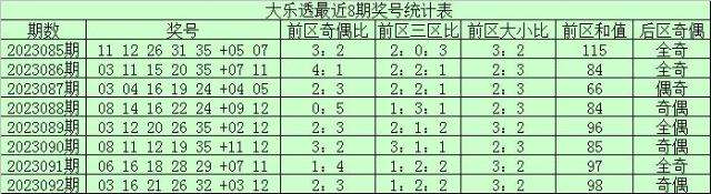 大乐透第2023092期奖号为:前区:03、16、21、26、32,后区:03、12。其中前区奇偶比为2:3,大小比为3:2,三区比为1:2:2,和值为98。