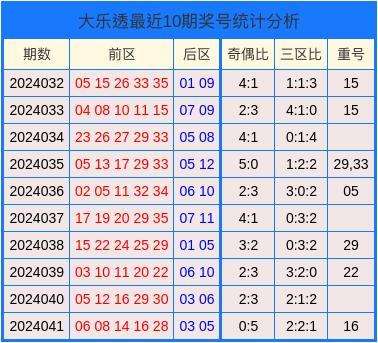 开奖回顾:大乐透第2024041期奖号:06、08、14、16、28+03、05。其中奇偶比为0:5,三区比为2:2:1,开出1枚重号16。