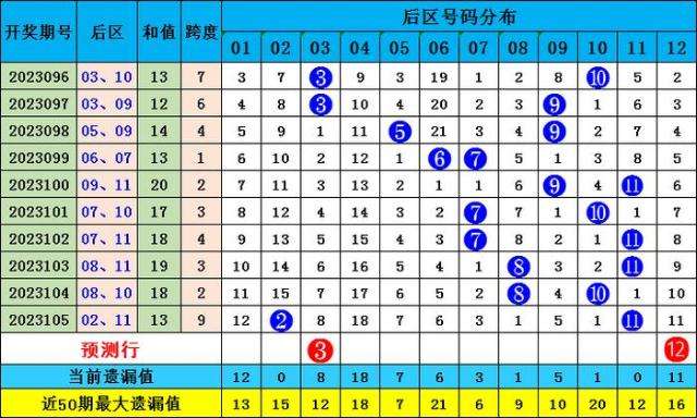 后区上期开出奖号02和11,为偶奇组合。近5期后区奇偶比为5:5,大小比为9:1。近10期后区奇偶比为13:7,大小比为15:5。预计本期小大、奇偶组合热出,参考两码:03 12。