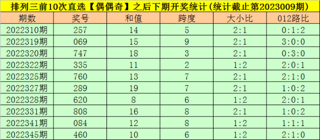 5。下期奖号跨度分别开出:5、9、3、2、7、7、6、8、8、6,其中跨度012路比为4:2:4,大小比8:2,奇偶比为5:5,本期适当关注奇数跨度开出,参考跨度7。