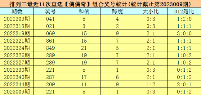 开奖回顾:排列三第2023009期开出奖号:221,类型为组三,和值为5,奇偶比为1:2,大小比为0:3,跨度为1。