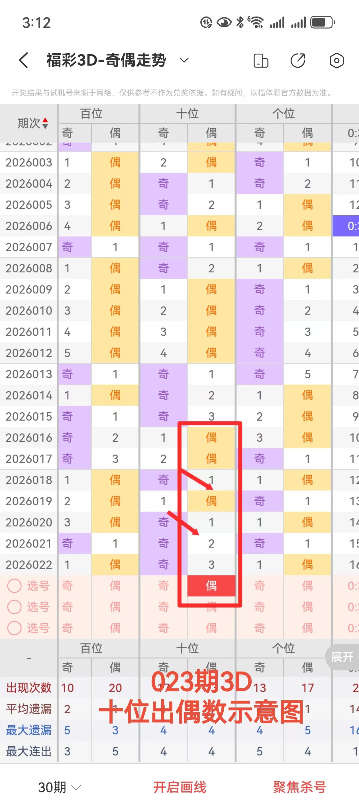 上期百位正确,十位正确,个位错误。坦率说,怎么也看不到个位会出大数,这就是彩票的魅力所在,让你看不惯我,又干不掉我。