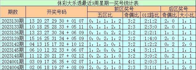 上期回顾:体彩大乐透上周星期一(第2024004期)奖号为02 06 18 19 27 + 08 09,前区奖号五区比为2:0:2:1:0,奇偶比为2:3,012路比为3:1:1,后区奖号奇偶比为1:1,大小比为2:0。