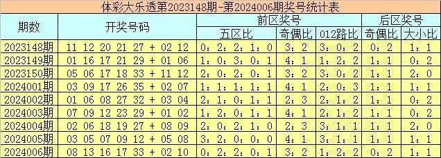 体彩大乐透第2024006期奖号为08 13 16 17 33 + 02 10,前区号码五区比为0:2:2:0:1,奇偶比为3:2,012路比为1:2:2,后区号码奇偶比为0:2,大小比为1:1。