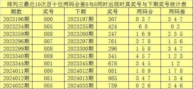 百十位合差分析:上期奖号百十位开出80组合,两码合为8,两码差为8,最近10次百十位两码合8与两码差8同时出现时,其奖号和下期奖号分别为: