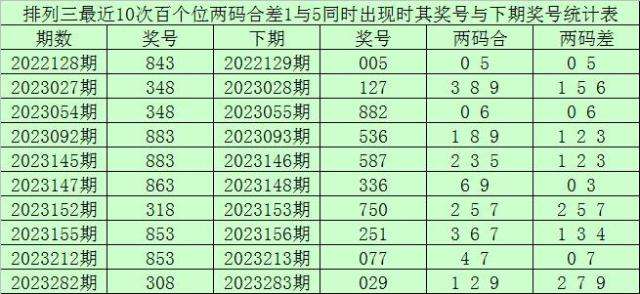 百个位合差分析:上期奖号百个位开出83组合,两码合为1,两码差为5,最近10次百个位两码合1与两码差5同时出现时,其奖号和下期奖号分别为: