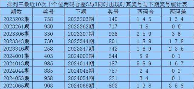 排列三第2024067期奖号两码合差分析: