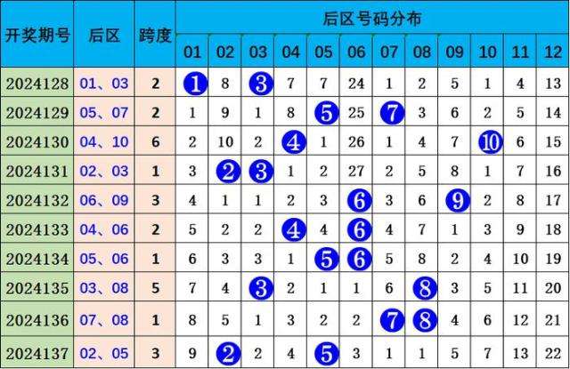 前二区(13-24):最近10期共开出15个号码,出号较冷,该区奖号本期关注:14、16。