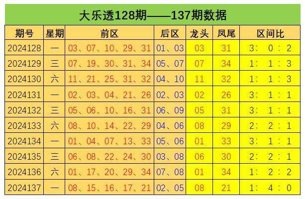 大乐透第2024137期出奖号统计:前区08 15 16 17 21,后区02、08,和值为77,跨度13,龙头08凤尾21,三区比为1:4:0,012路比为2:1:2,奇偶比为3:2,大小比为1:4,冷热比为2:3,1枚重号,1组连号。