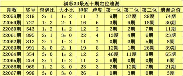 开奖回顾:福彩3D第2022067期奖号:998,百位号码遗漏0期、十位号码遗漏3期、个位号码遗漏0期,遗漏总值为3期。
