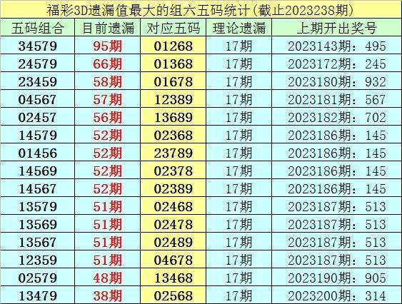 4。截止第23238期,五码组六遗漏最大的是:34579,当前遗漏95期。短期解冻的可能性较小,则23239期奖号分布在34579-01268之中的可能性最大。