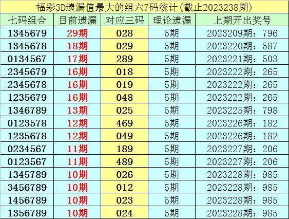 1。截止第23238期,七码组六遗漏最大的是:1345679,当前遗漏29期。