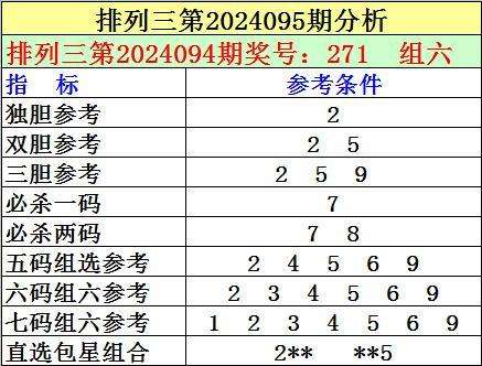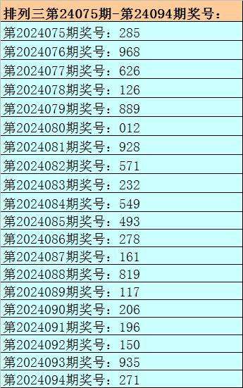 1。排列三最近十期分别开出号码:493-278-161-819-117-206-196-150-935-271,其中有6期奖号开出了上期的重复号码,本期预计第2024094期奖号:271中有重号,参考号码:2。