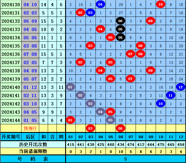 前区重号走势:上期前区没有开出重复奖号,最近10期中重号出现6期,本期预计重号继续走冷,排除重号。