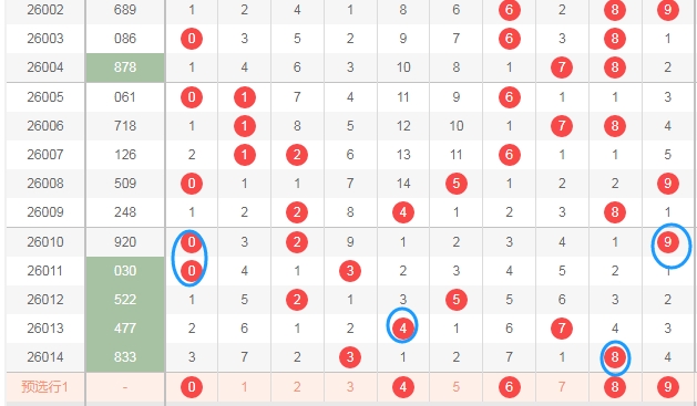 上图是体彩排列三开奖号码分布走势图,我在上面走势图中标注出来的蓝色圈圈表示的都是合数,上期开奖号码338是两个质数一个合数组合,最近三期开奖号码中都是质数多,合数少组合,本期个人观点合数0 4 6 8 9至少得来1个吧。