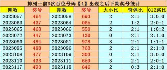 百位号码:百位上期奖号为0路、偶数、小号:4,历史上百位号码4共开出700期,前一次开出期数在第2023117期,上期奖号隔15期再次开出。