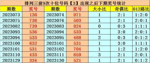 在十位前9次出现号码3后,其下期奖号分别开出:7-0-2-3-8-3-0-5-2,其中奖号个数012路比是4:1:4,奇偶比是4:5,大小比是3:6。