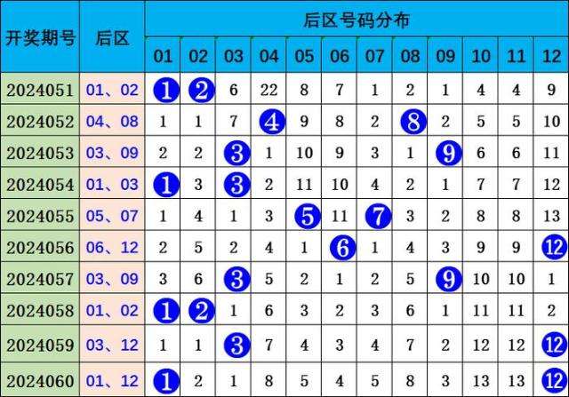 上期后区开出号码:01、12,