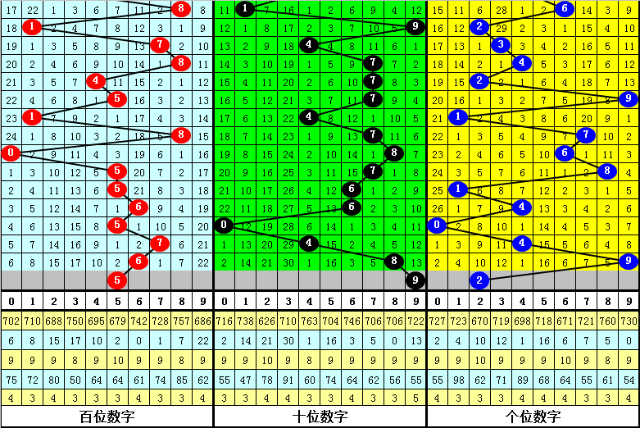 跨度分析:3D上期跨度为3,跨度近期波动较小,一般出现在2-5之间,本期看好跨度出现在5-9之间,最大跨度参考6789,参考跨度7。