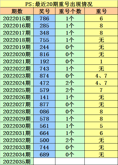 最近100期开奖中,含有重号的奖号有59期,最近20期含有重号的奖号有11期,最近10期含有重号的奖号有5期。本期注意重号落号。