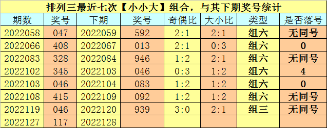 大小分析:排列三上期开出号码117,大小类型为【小小大】,最近七次开出大小类型小小大的奖号分别为:047、408、328、345、046、415、046,其下期分别开出号码:592、013、946、046、083、092、939。其中号码大小比为9:12,大小号码基本平衡,本期预计小号大热,重防全小组合开出。