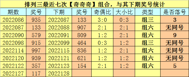奇偶分析:排列三上期奖号为117,其奇偶类型为【奇奇奇】,最近七次出现奇偶类型奇奇奇的号码分别为:935、133、579、915、997、939、357,其下期奖号分别为:935、133、579、915、997、939、357。其中号码奇偶比为10:11,奇偶奖号开出比例基本相当,本期奇数热出的可能性较大,预计出现2个奇数号码。