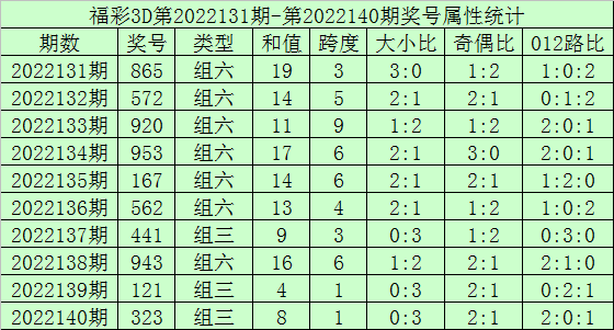 开奖回顾:福彩3D第2022140期开奖号:323,其中奖号和值:8,奇偶比2:1,大小比0:3。