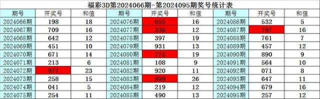 上期回顾:福彩3D第2024095期奖号为:257,其中奖号组选类型为:组六,奇偶比为2:1,大小比为2:1,012路比为0:1:2,和值为14,跨度为5。