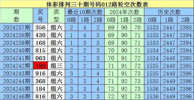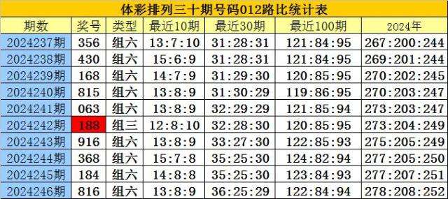 开奖回顾:排列三第2024246期奖号为:816,号码012路比为1:1:1。