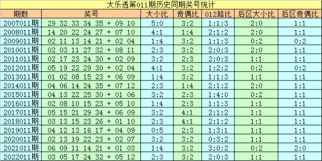 后区判断:后区第011期历史同期奖号大小比总比例为16:16,大小号码走势基本持平,本期预计大小号码继续平衡开出,看好一大一小组合出现,两码关注05、11。
